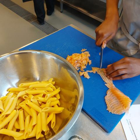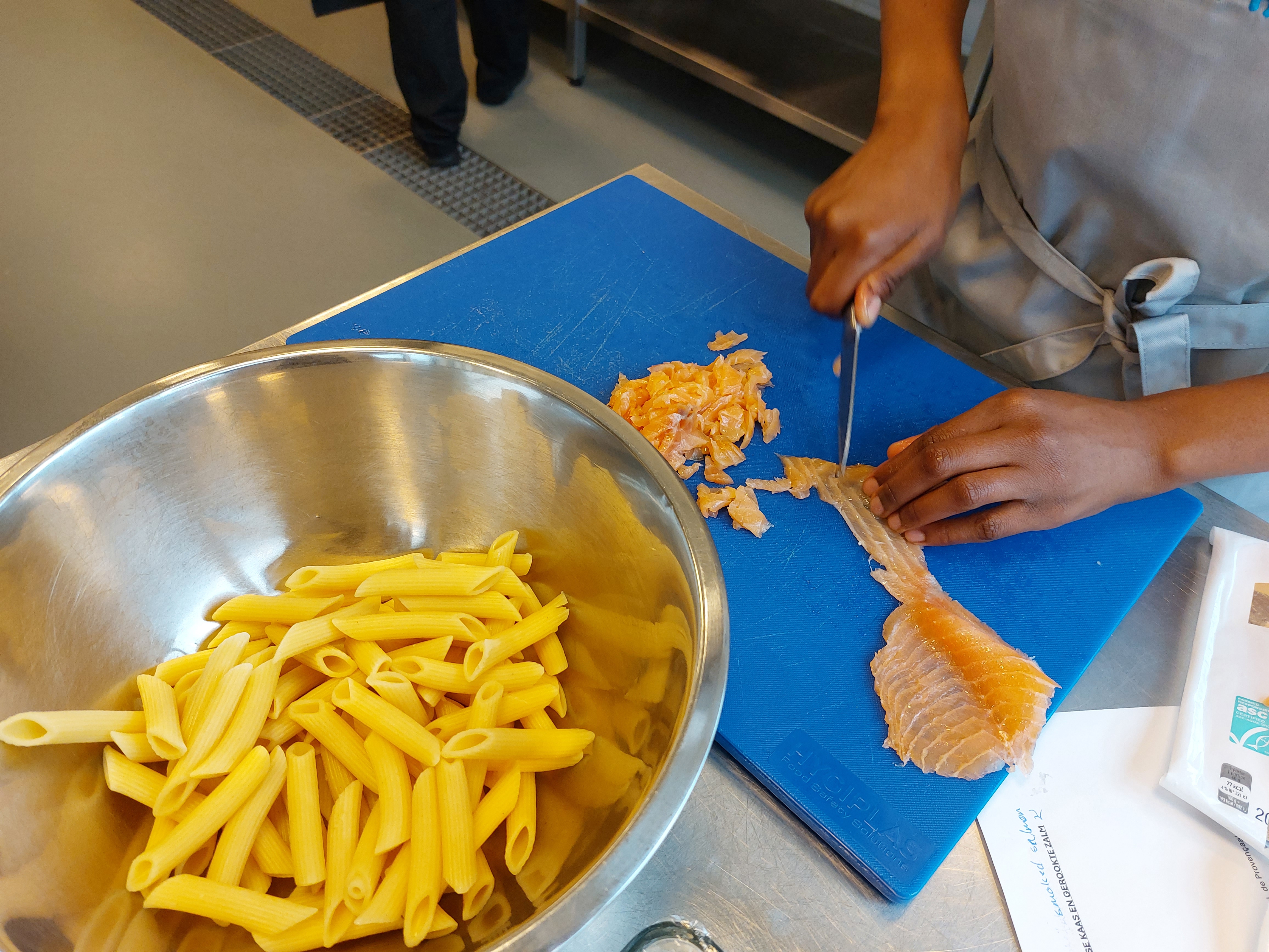 - Snij de gerookte zalm in fijne reepjes.